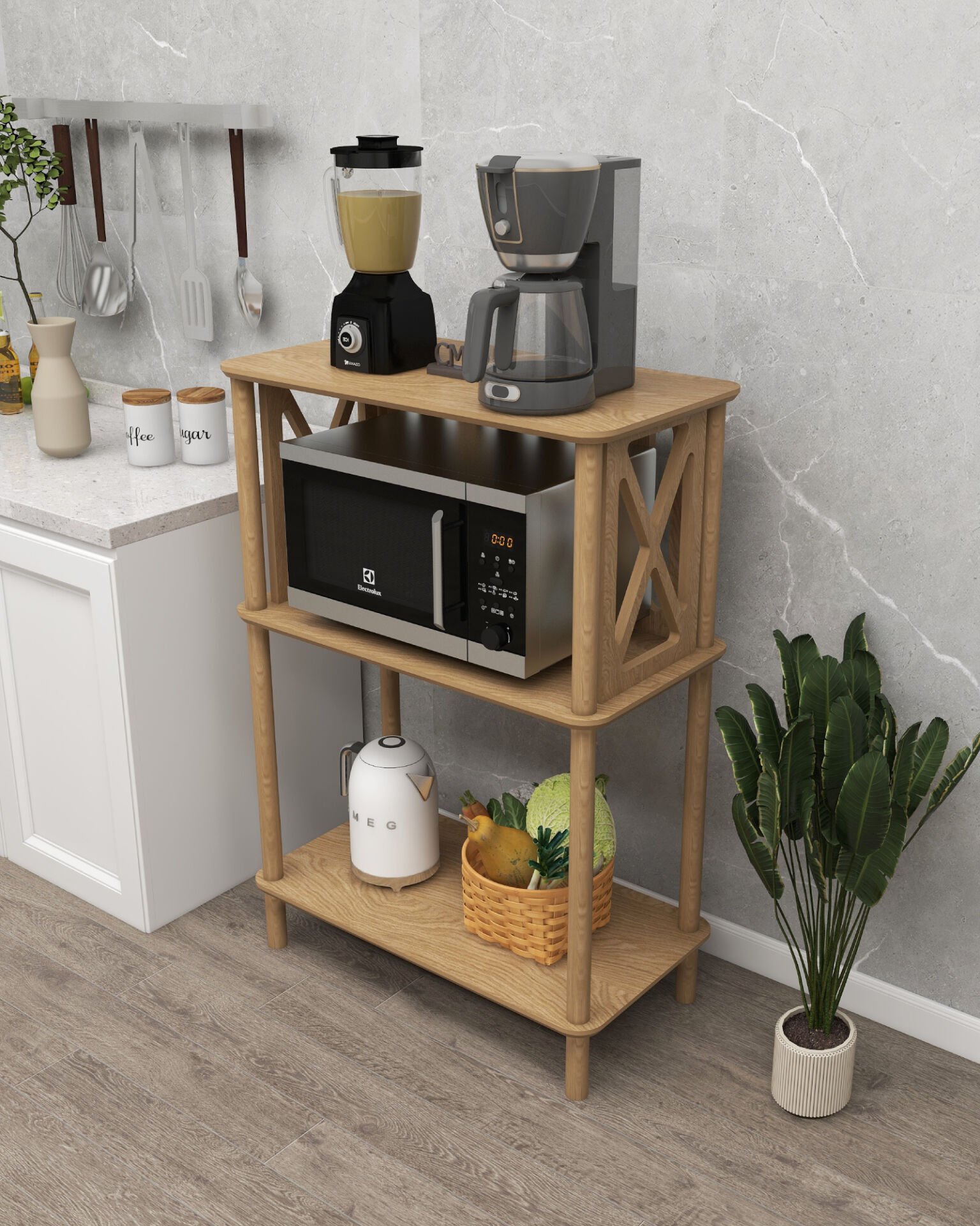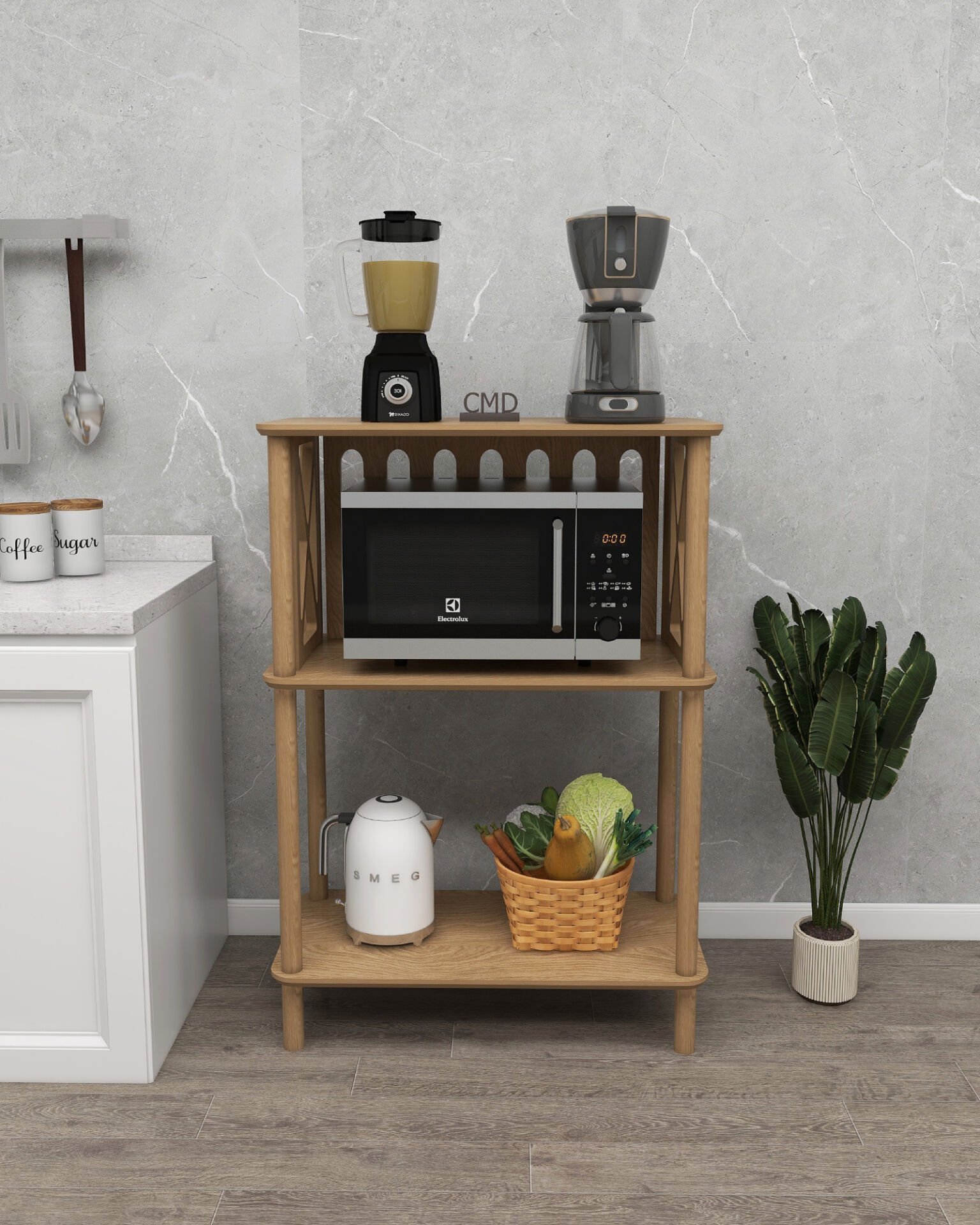 Mutfakta kahve köşesi, balkonda kitaplık, ofiste düzenleyici veya otel odalarında ikramlık standı olarak kullanabileceğiniz fonksiyonel bir çözüm sunar.