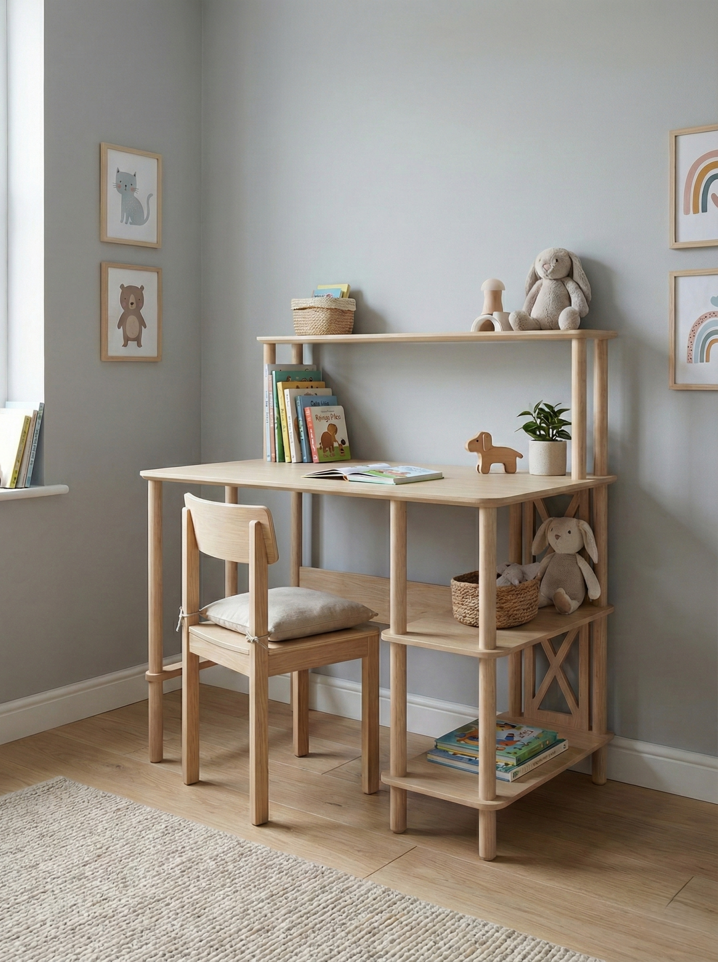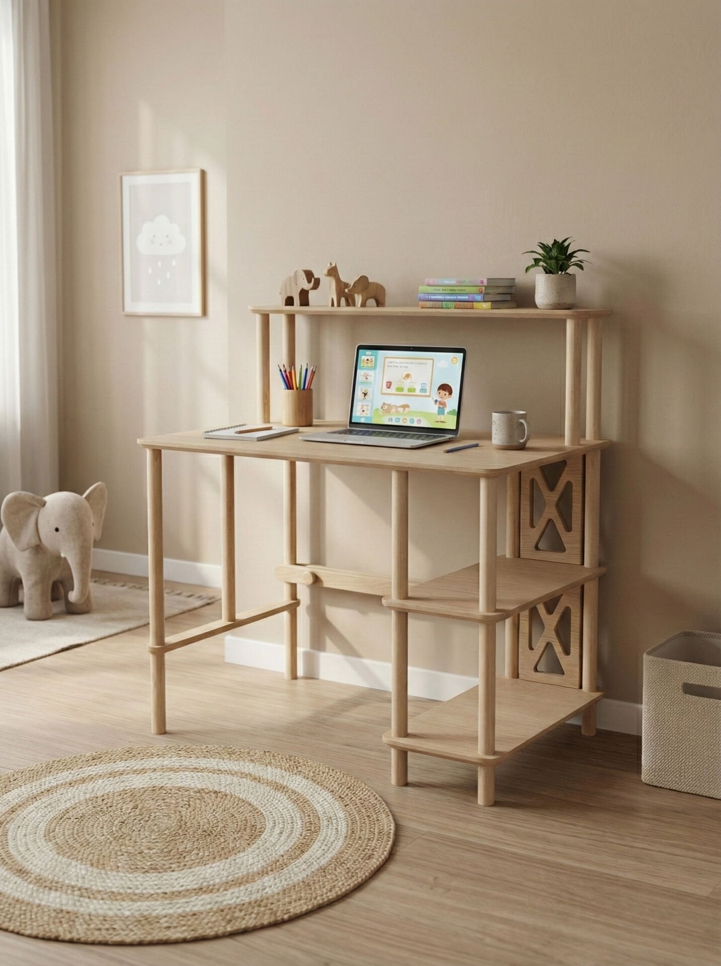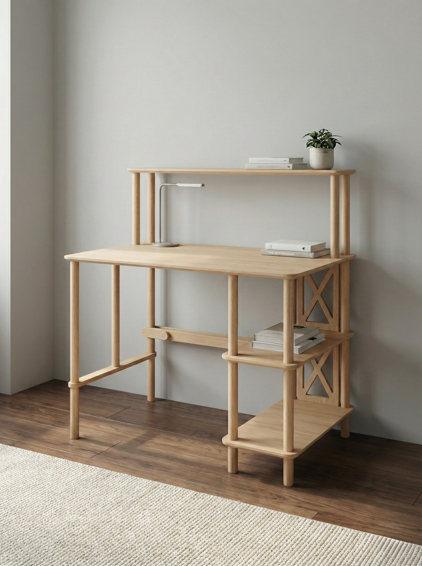 Doğal ahşap dokusu ve sade çizgileri ile modern, İskandinav ve doğal dekorasyon stilleriyle uyum sağlar. Açık renkli ahşap görünümü çalışma alanına ferah ve sıcak bir atmosfer kazandırır.