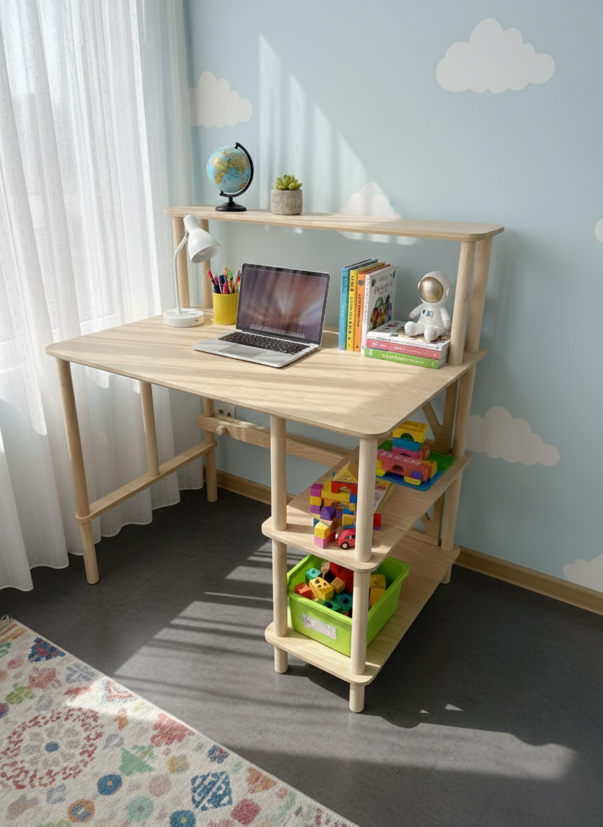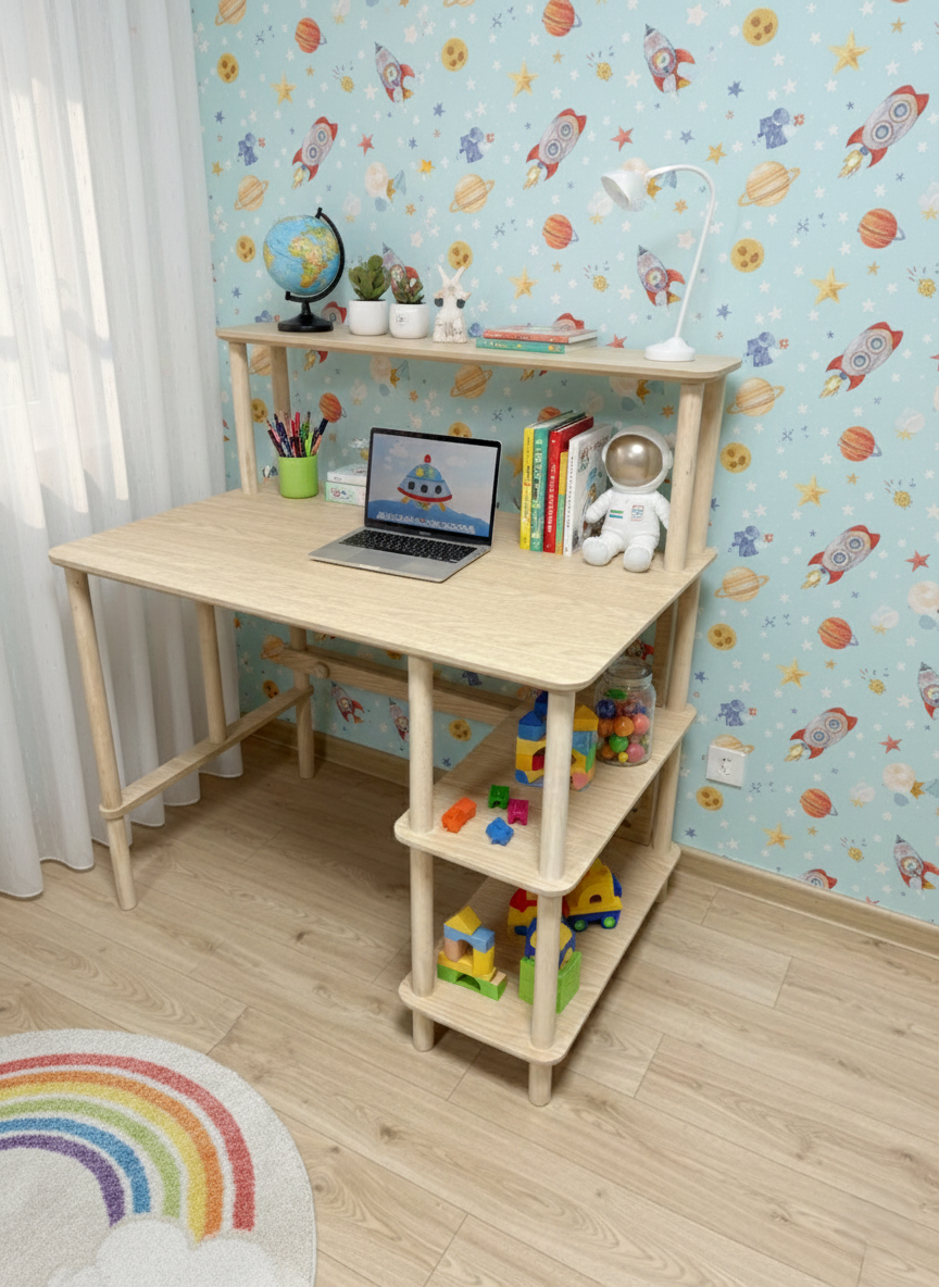Geniş masa tablası; bilgisayar, kitap ve çalışma ekipmanları için konforlu bir kullanım alanı sağlar. Yan bölümde yer alan çok katlı raf sistemi; kitap, dosya, ofis aksesuarları ve dekoratif objeler için pratik bir depolama alanı sunar. Üst raf bölümü ise ek saklama ve sergileme alanı oluşturur.